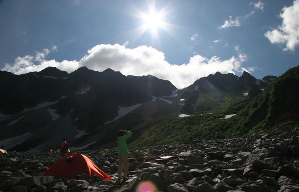 ![]() テント場からの北穂の景色も素晴らしい!テントはアライテントのゴアライズ2&フライです。 |