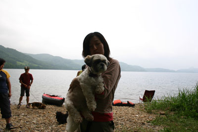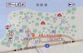 | campground | @このあたりに車を止めてA湖岸に設営 大川をはさんで右側がフリーサイト |